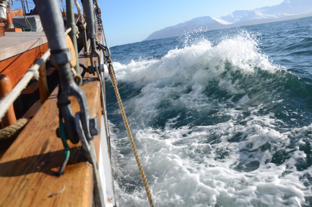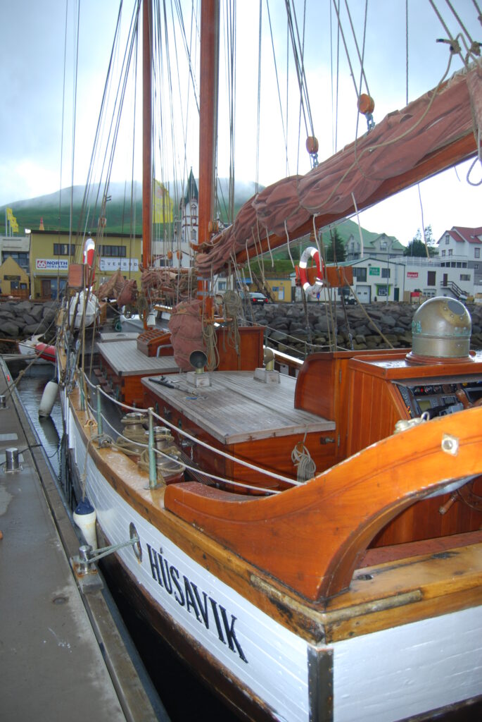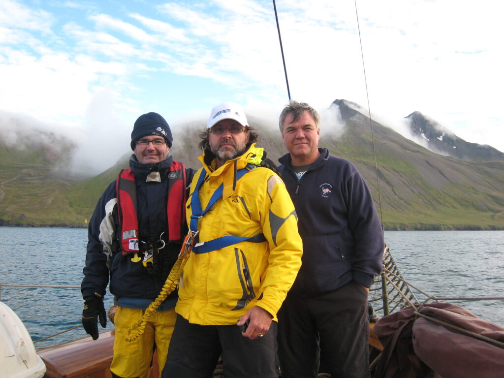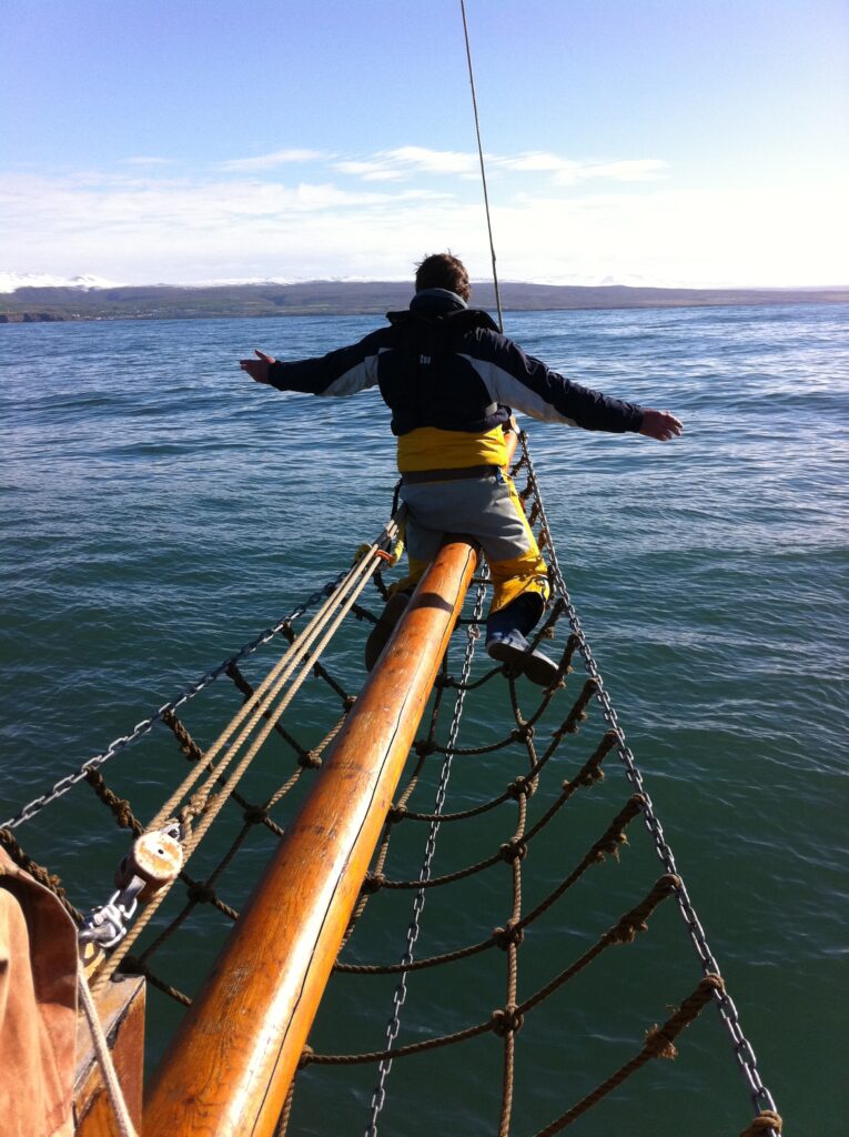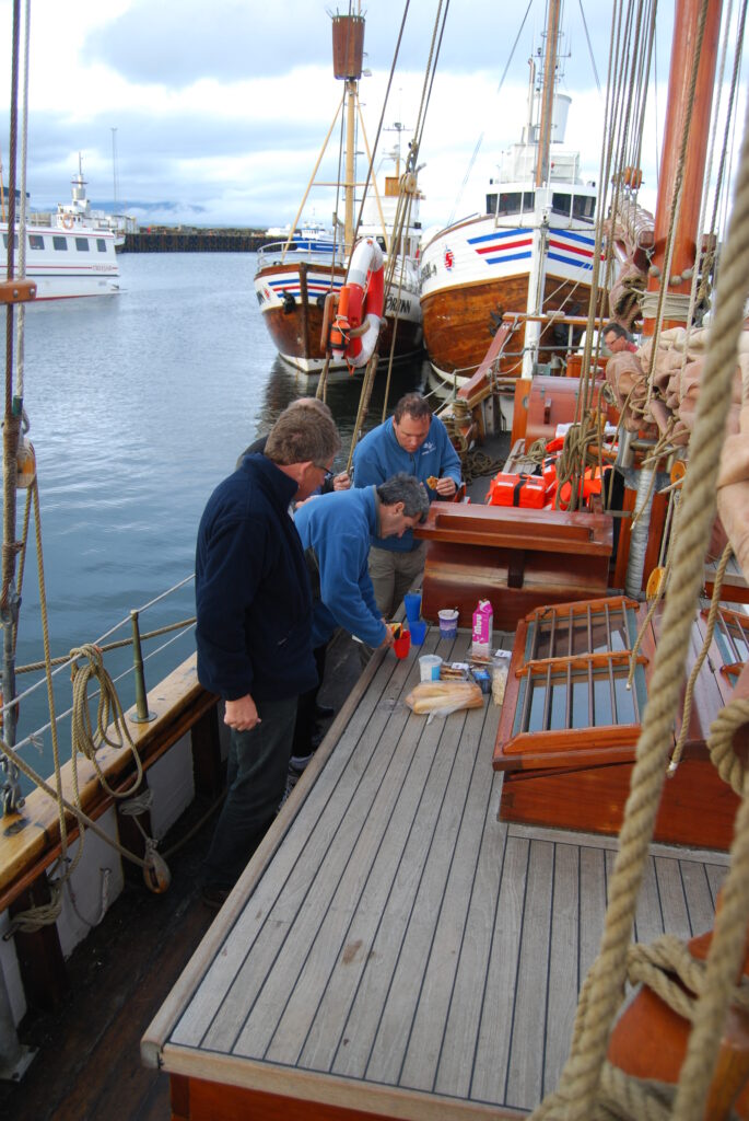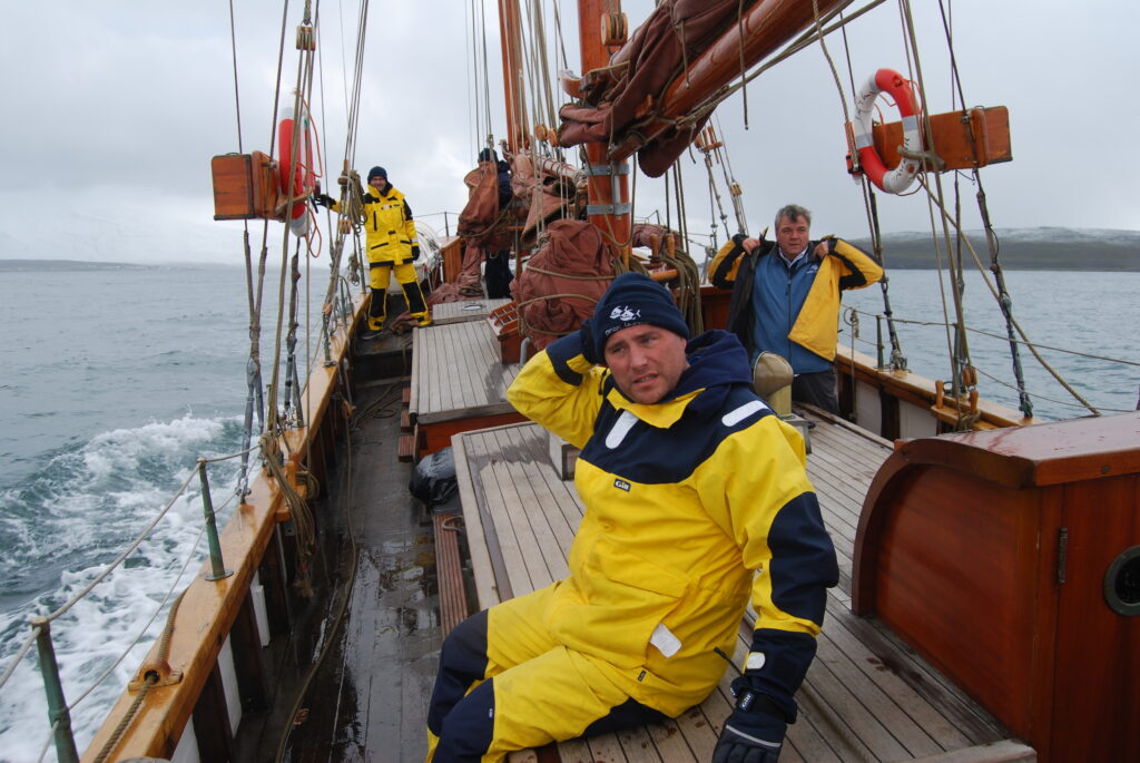 Haukur was set for gentle whale watching tours, not for a typical Phat Buoy voyage, hoisting the heavy canvas sails proved nearly disastrous — “don’t let them touch the water or they’ll drag us under!” — and Simon, acting as human ballast, nearly went with them.